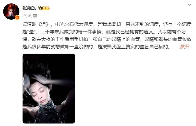 巡演叫《追》,电光火石代表速度,是我想要却一直达不到的速度。还有一个速度是“量”,二十年来我做到的每一件事情,就是我已经拥有的速度。我以前有个习惯,熬完大夜的工作后用手机拍一张自己的眼睛上的血管,眼睛和额头的血管妆效是我很多年前就想做却一直没做的,是按照我脸上真实的血管自己描的。算是我这二十年来努力过的“证据”吧,不然要怎么追到今天的自己。其实,二十年的时间也是一个速度吧,胶原蛋白流失的速度,哈哈哈突然有点庆幸以前脂肪够多…